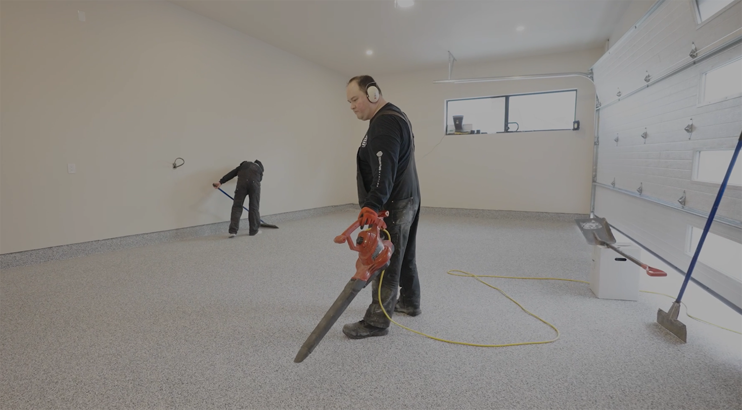 Flake Application: Decorative vinyl chips are broadcast over the wet base coat for texture and visual appeal.